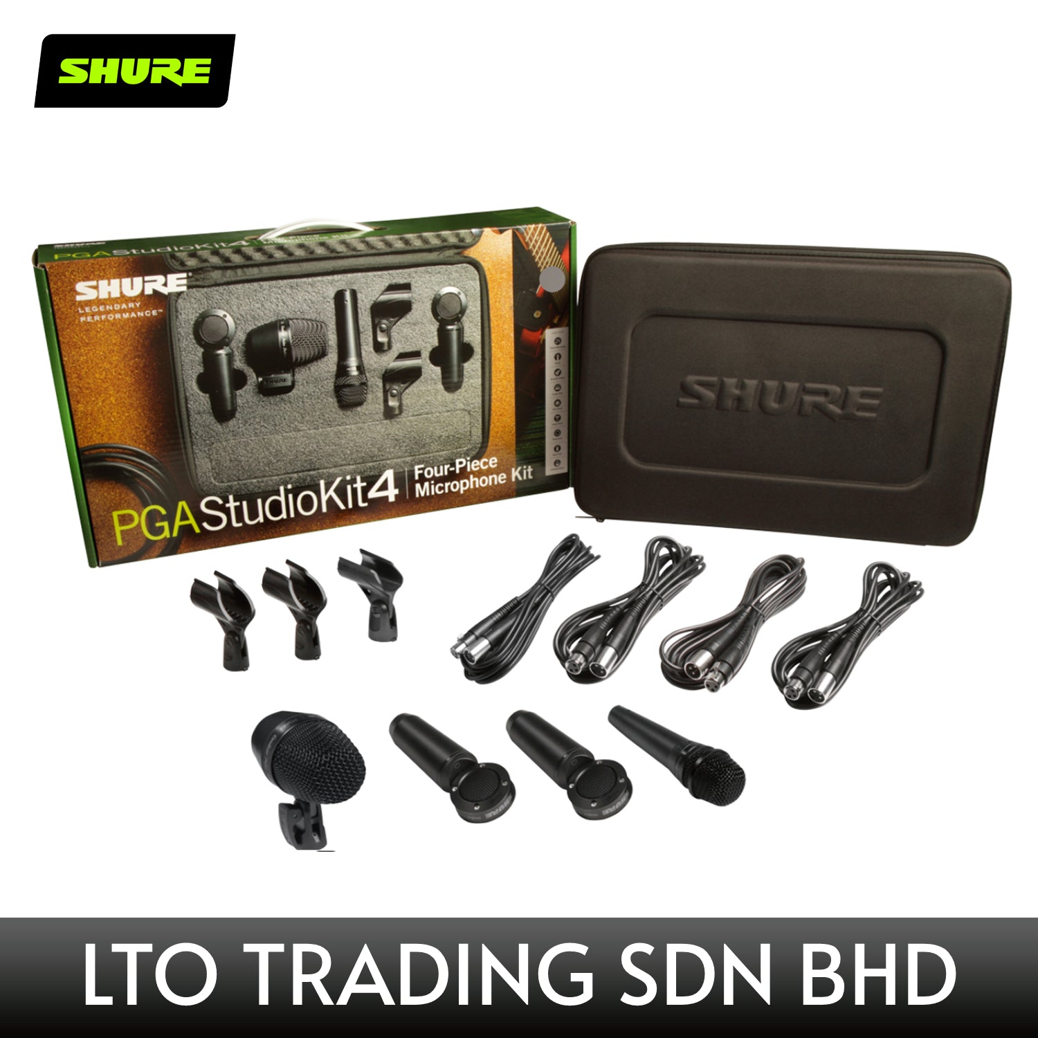 - 4-piece mic package with Shure PGA52, Shure PGA57, 2 x Shure PGA181, 3 x clips, 4 x cables, and case
